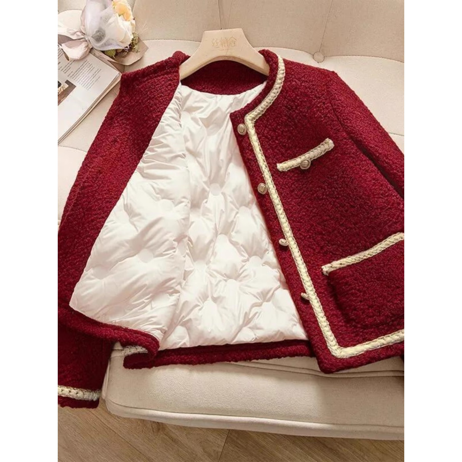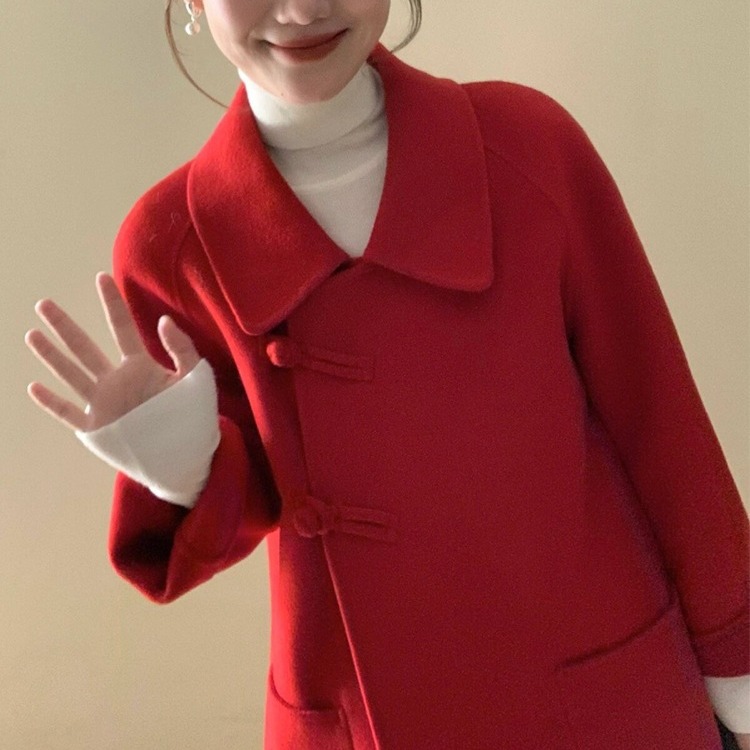 現物新中国風の国風の赤い毛は上着の女性の冬の新型の唐装の新年の赤いコートのスーツです。
