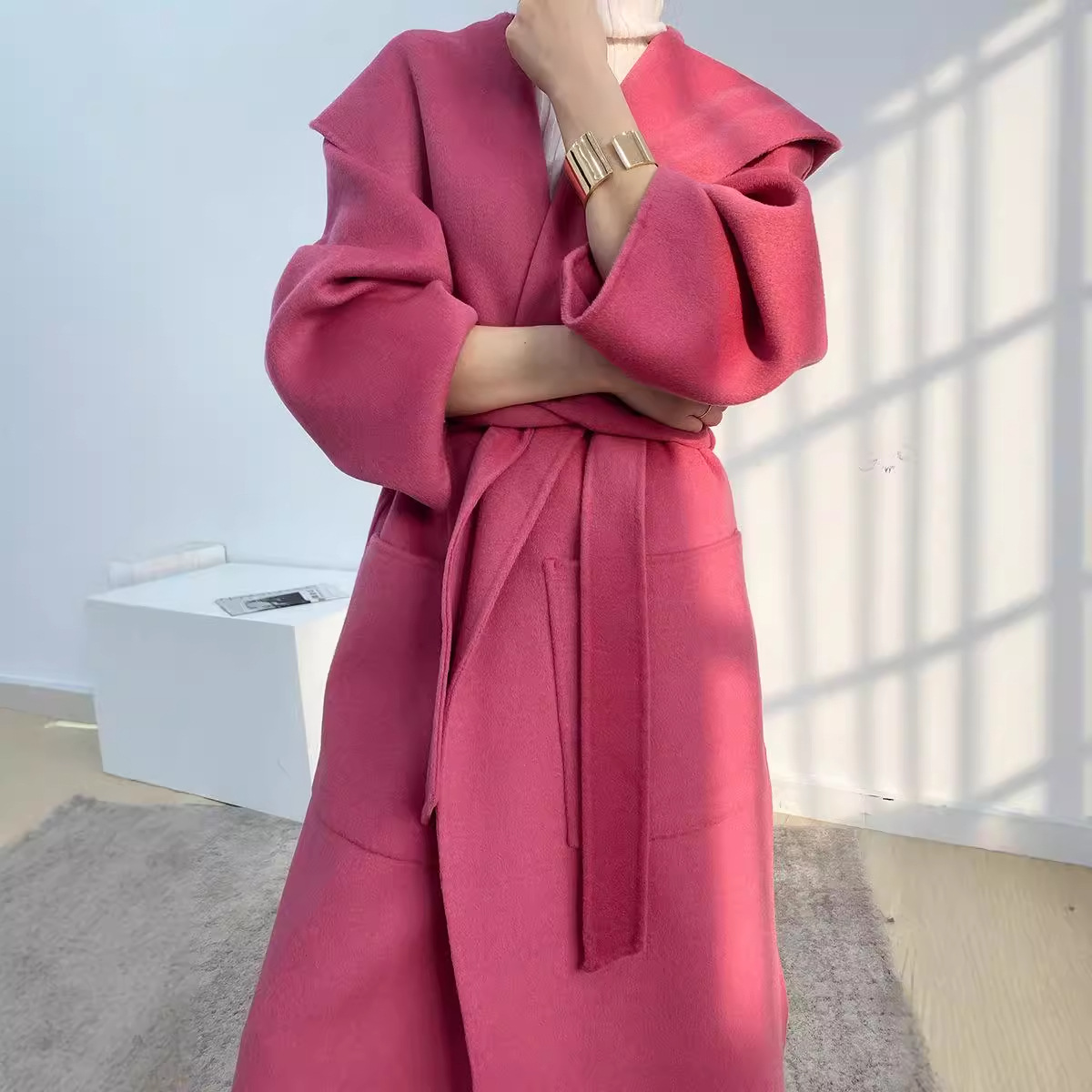 【シチリア】両面カシミヤコート女性2024冬韓系赤いストラップ