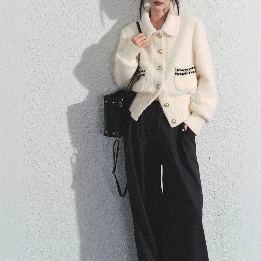 小香風両面ウールコート女性ショート2024新小柄ゆったり高級感毛ショートコート