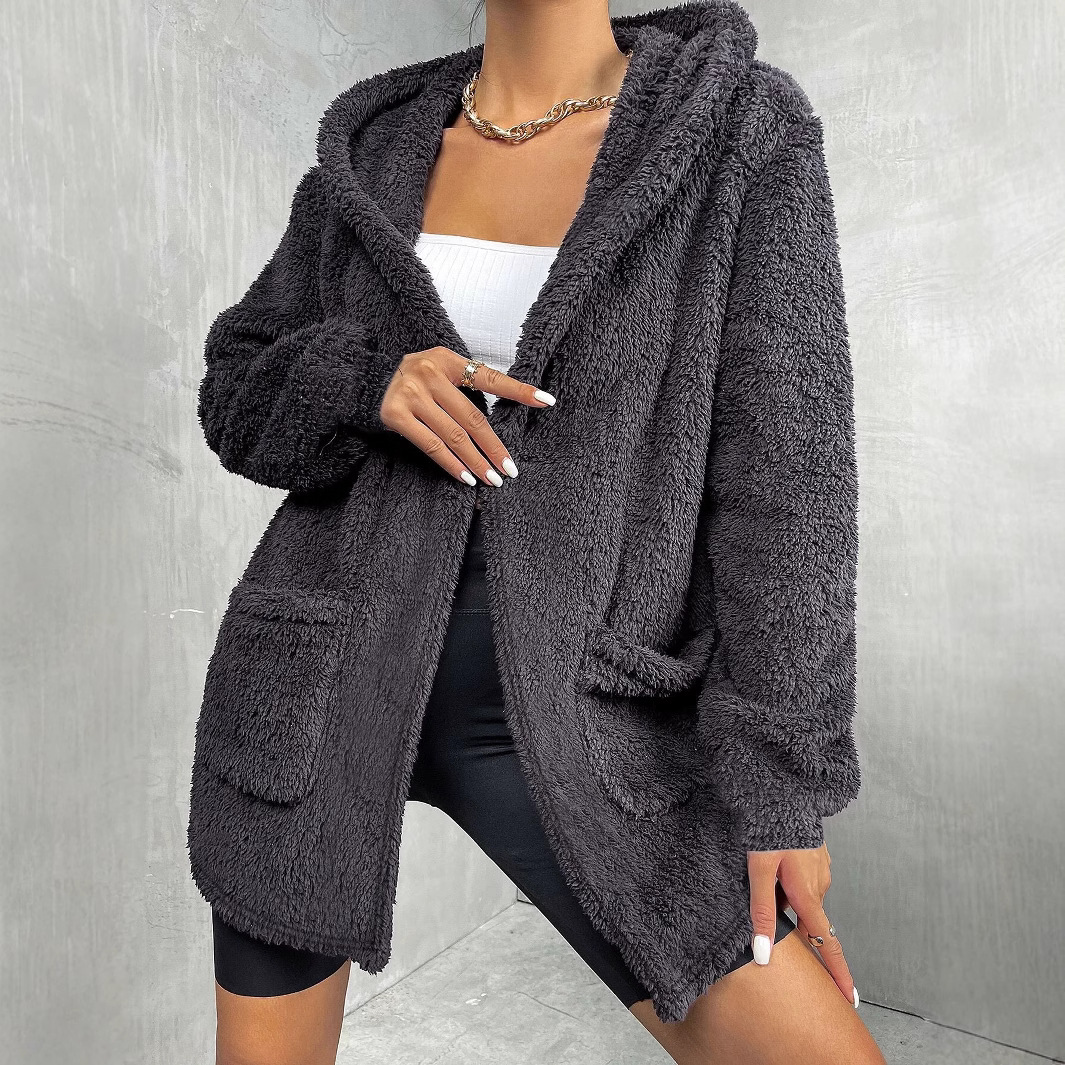 欧米の女性服コートファッションカジュアル純色フード付きポケット付き女性のぬいぐるみコート秋冬新作女性