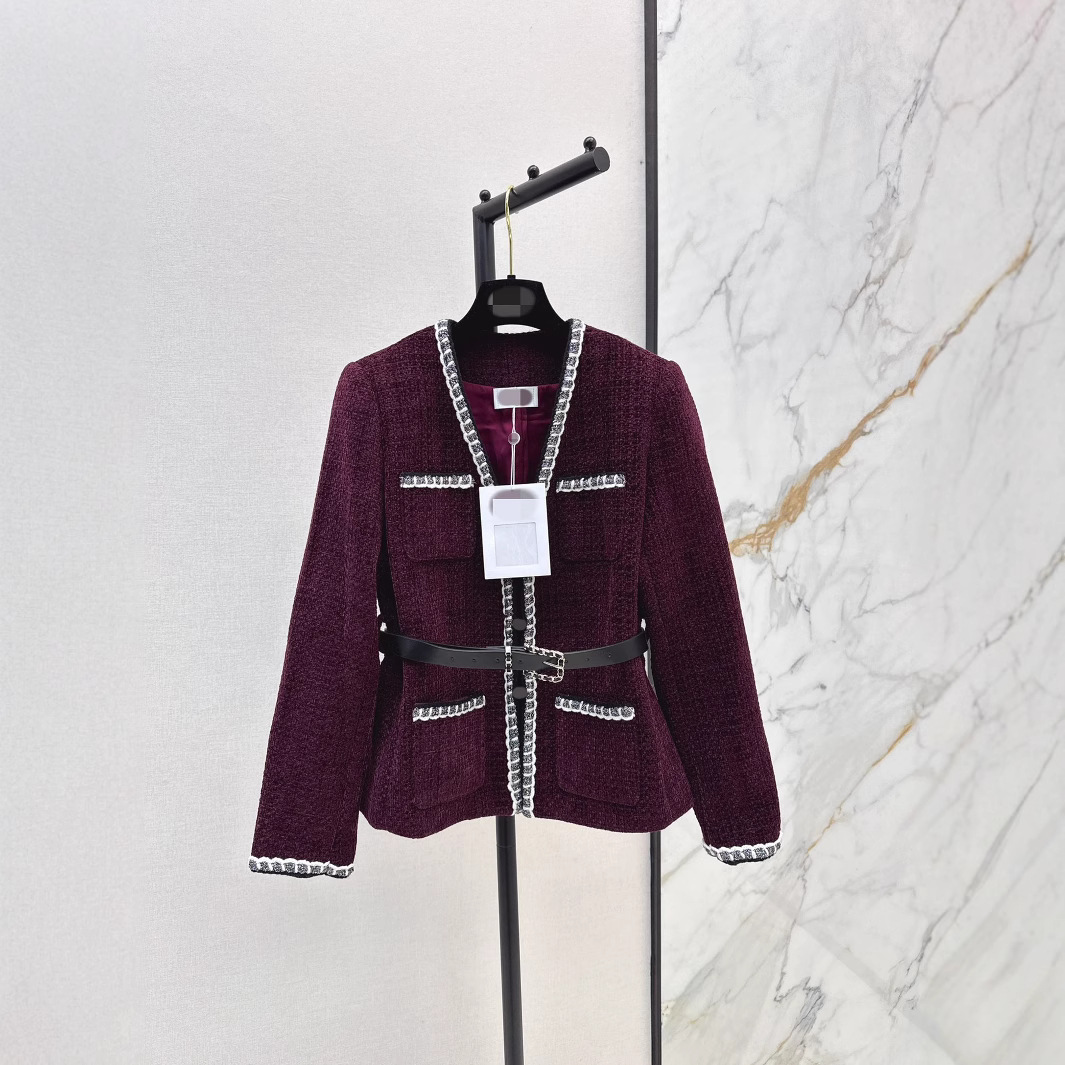 深センの南油の24朝の春の金のフランスの小さい香風の紫色の織り目の縁の丸首の4口の袋の粗い花のコートの女性