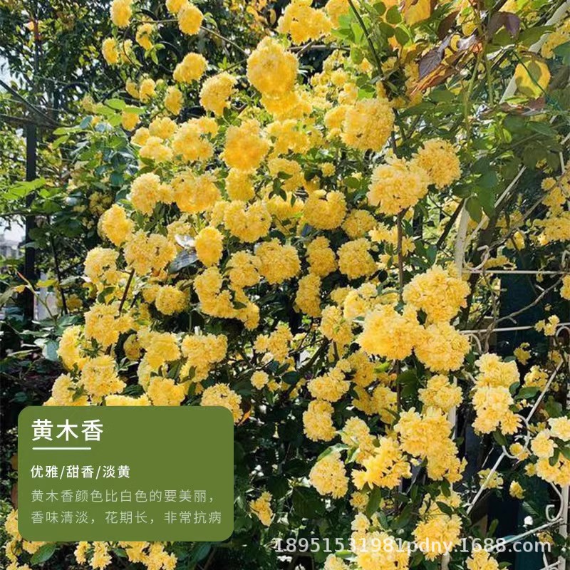 黄色の木の香りの花の苗、つる性の壁植物、庭の耐寒性のつる性バラの鉢植えの花、強い香り、四季の白と赤の木の香り