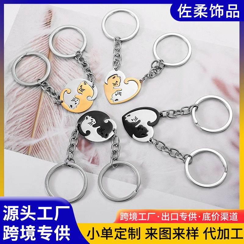 アマゾンのステンレスの愛の子猫のキーホルダーのカップルは猫の陰陽のキーチェーンの自動車のペンダントのキーリングをつなぎ合わせます。