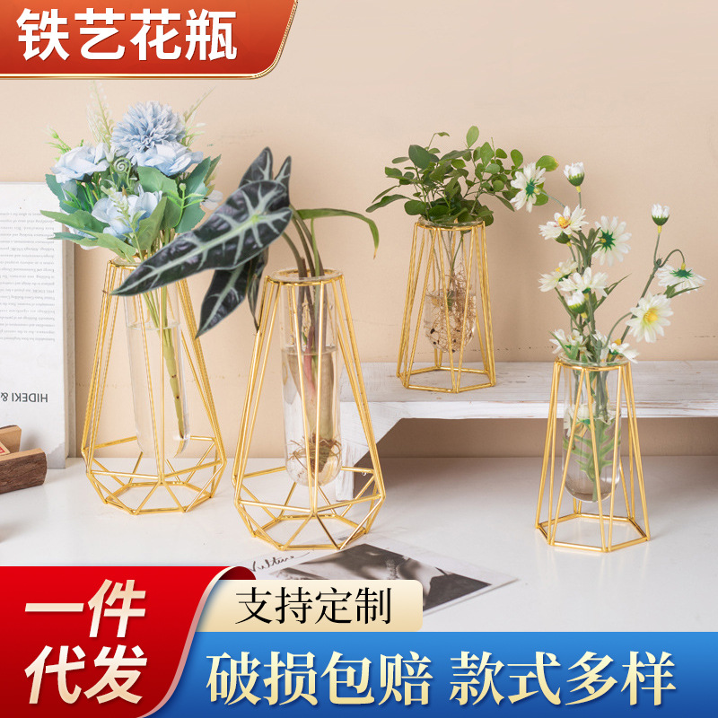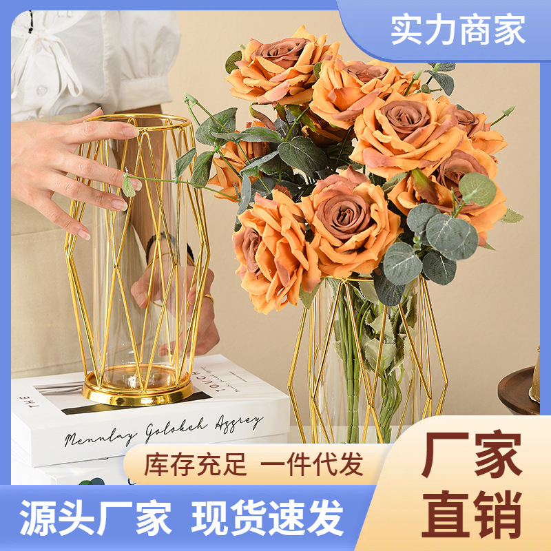 国境を越えた売れ筋の金メッキ鉄ガラス花瓶、リビングルームのテーブル装飾、ドライフラワー、クリエイティブな家庭用家具