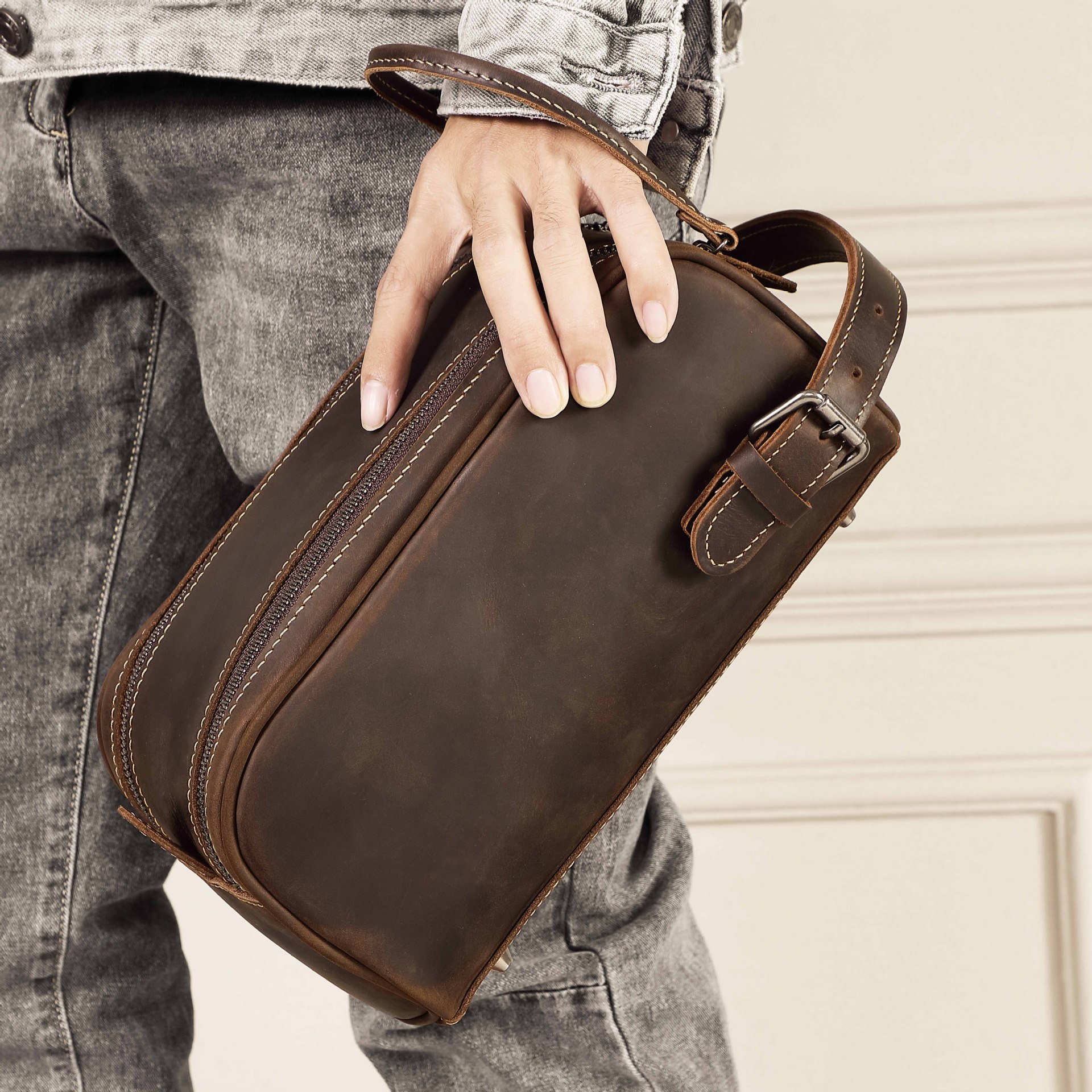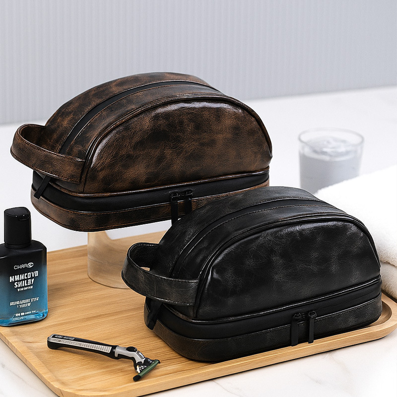 楽活旅行洗面バッグ男乾湿分離大容量携帯化粧バッグ皮革二重洗面バッグ