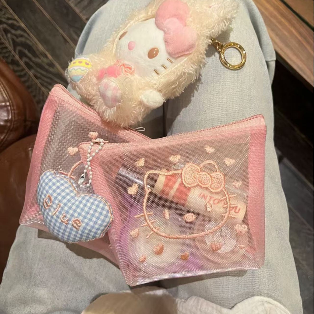 かわいいハローキティメッシュ収納袋ガーリーハート刺繍 KT 口紅バッグポータブル小銭入れ ID バッグ雑貨バッグ