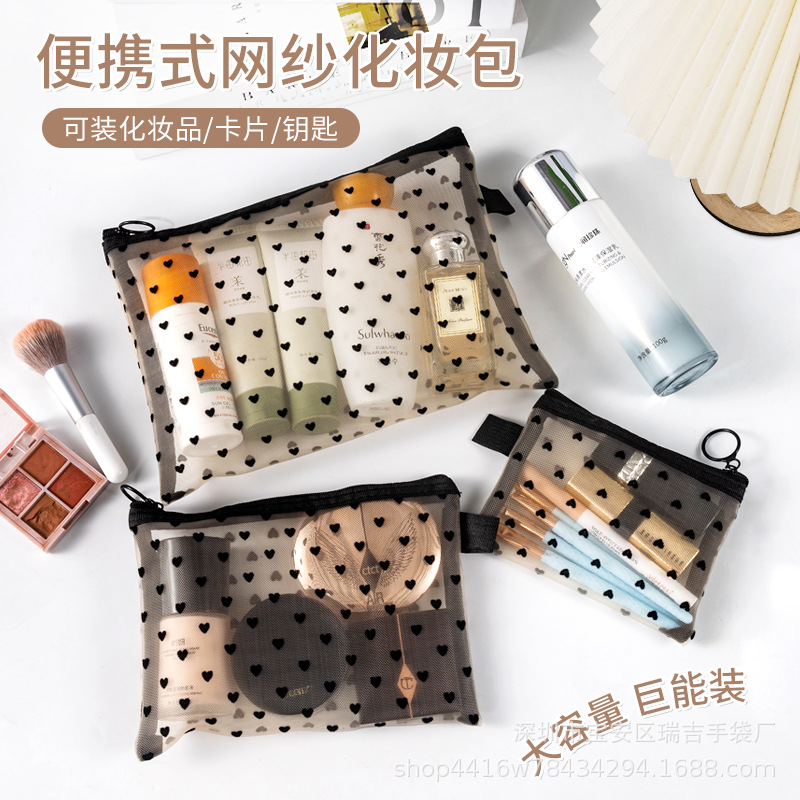 メッシュ化粧品バッグ、ポータブルコインヘッドフォン収納バッグ、ポータブルトラベルトイレタリーバッグ、植毛ラブリップスティックバッグ卸売
