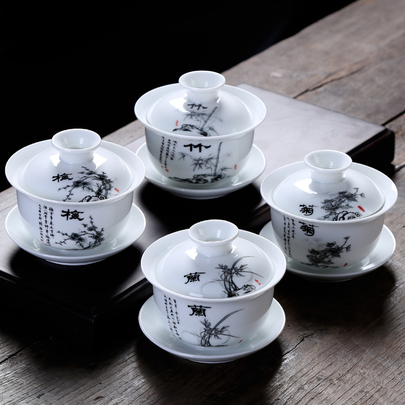 手描きの白い磁器の蓋の茶器の卸売りはお茶を入れて碗の3才の碗の梅蘭竹の菊のビジネスの贈り物をかぶせます。