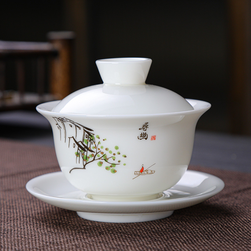 羊脂玉の白い磁器の蓋の碗の3才の簡単な工夫の茶器の家庭用の単一のお茶の碗の卸売りはlogoの贈り物をすることができます。
