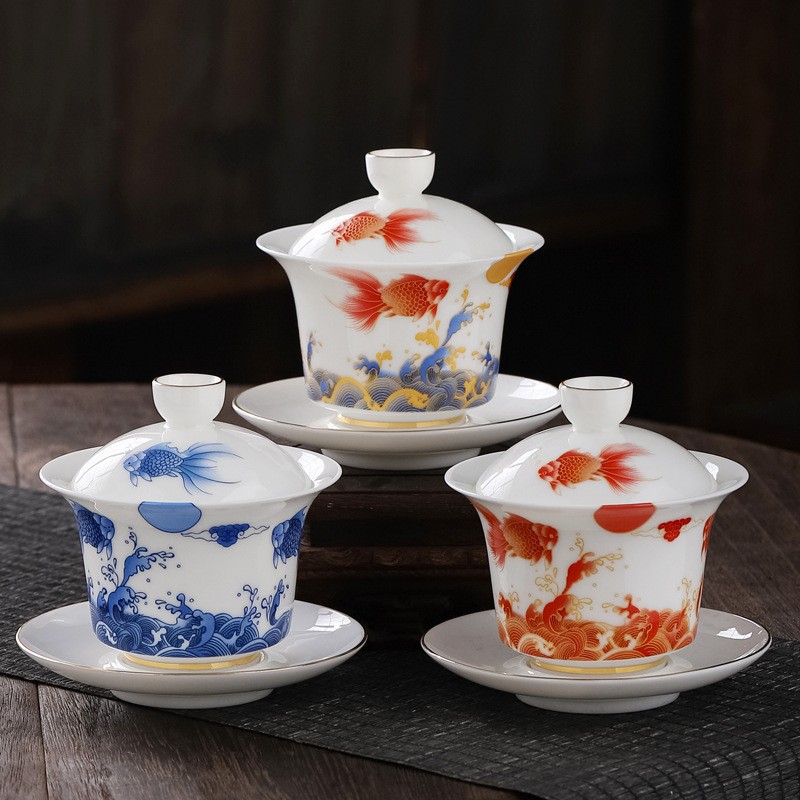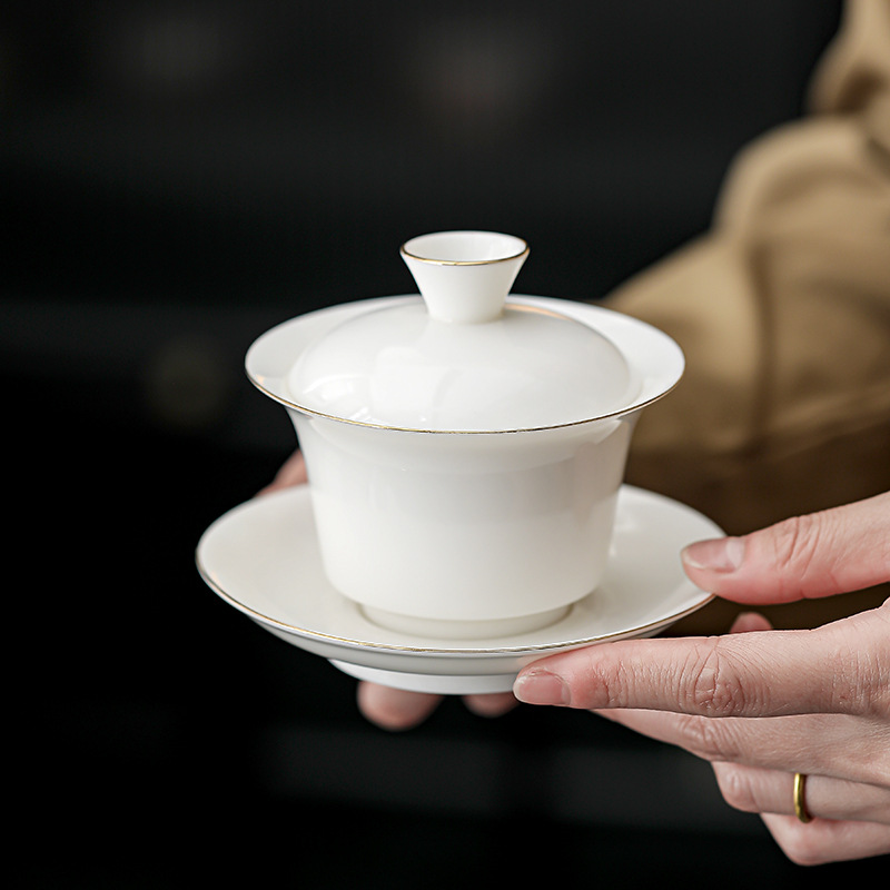 羊脂玉描金三才蓋碗陶磁器茶碗大サイズ敬茶碗工夫茶器ビジネスプレゼントLOGO