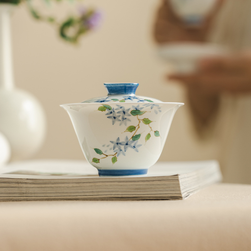 玉泥白磁手描き青花竹蓋碗釉薬上彩文人泡茶蓋碗素雅主泡碗茶杯