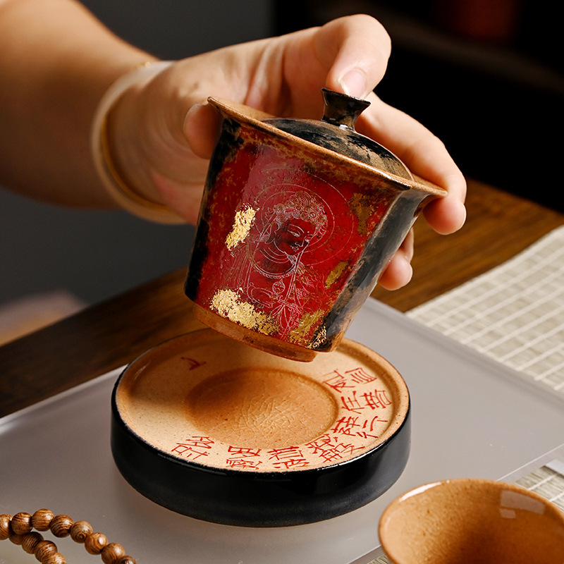 国風敦煌純手描き描金蓋碗復古手掴み碗高級家庭用陶磁器開片工夫茶泡器