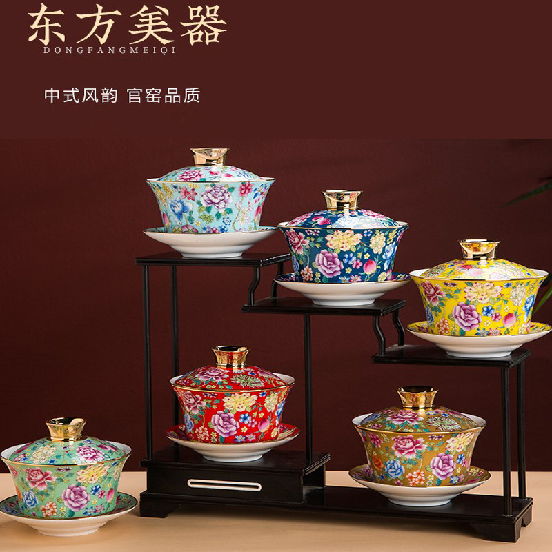 万花エナメル彩三才工夫茶蓋碗家庭用単一レトロ中国式宮廷泡茶杯景徳鎮陶磁器