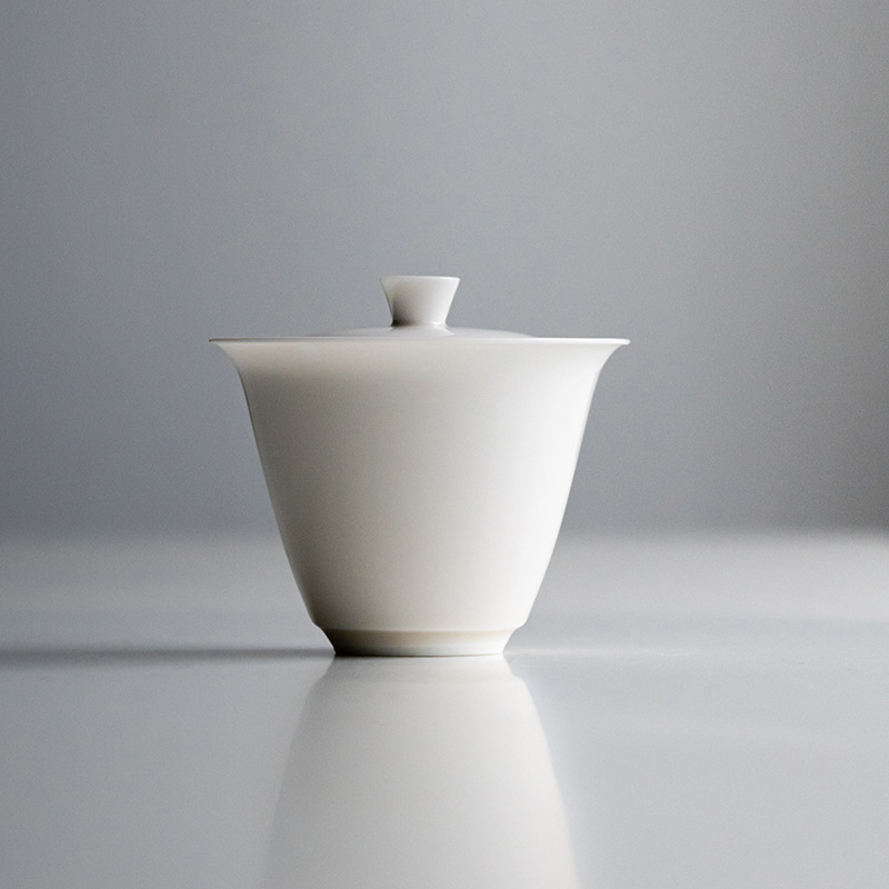 杏白のシンプルな蓋碗の白い磁器の蓋碗にお茶を入れます。