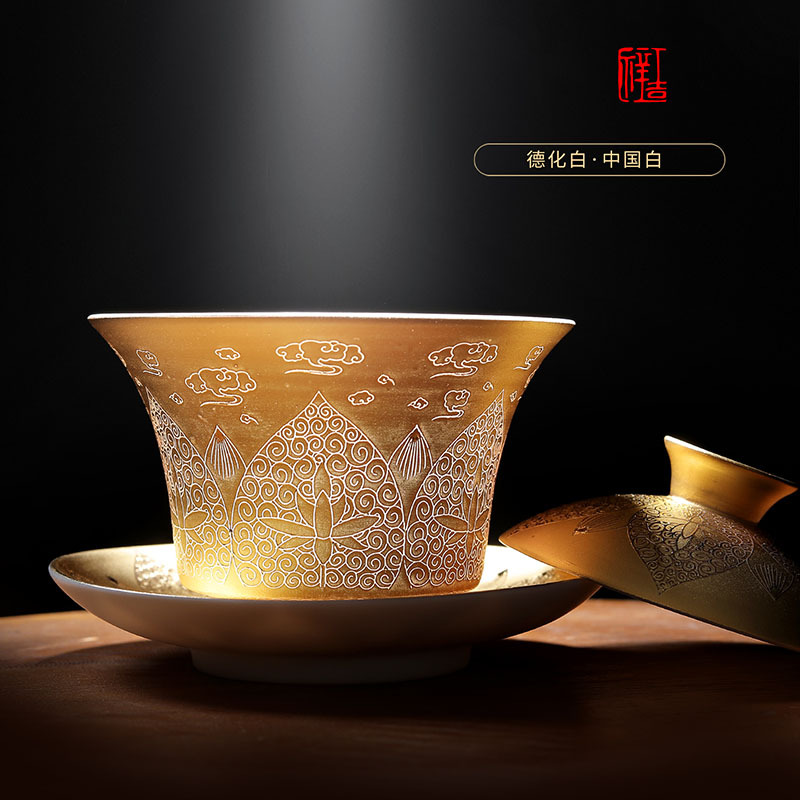 聚陶堂の手作りの金の陶磁器の3才は碗の単一の高級な家庭用の大きいサイズの工夫をかぶせてお茶の碗のギフトボックスを敬います。