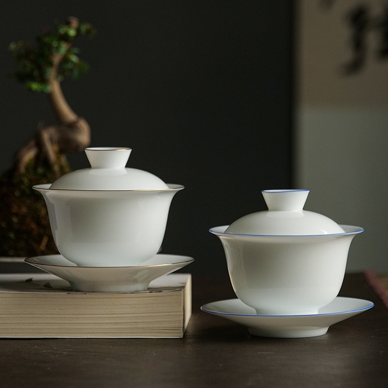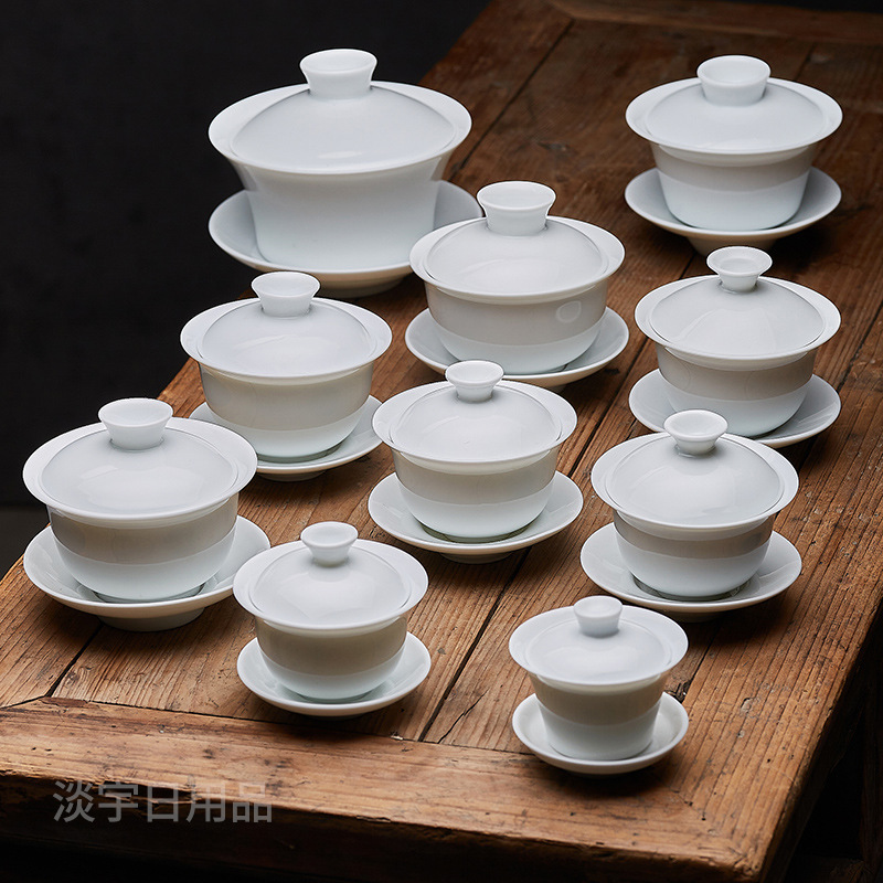 ティーセット大中小カバーボウル/純白家庭用中国風火傷防止手作り茶碗セラミック手作りシンプルな白磁