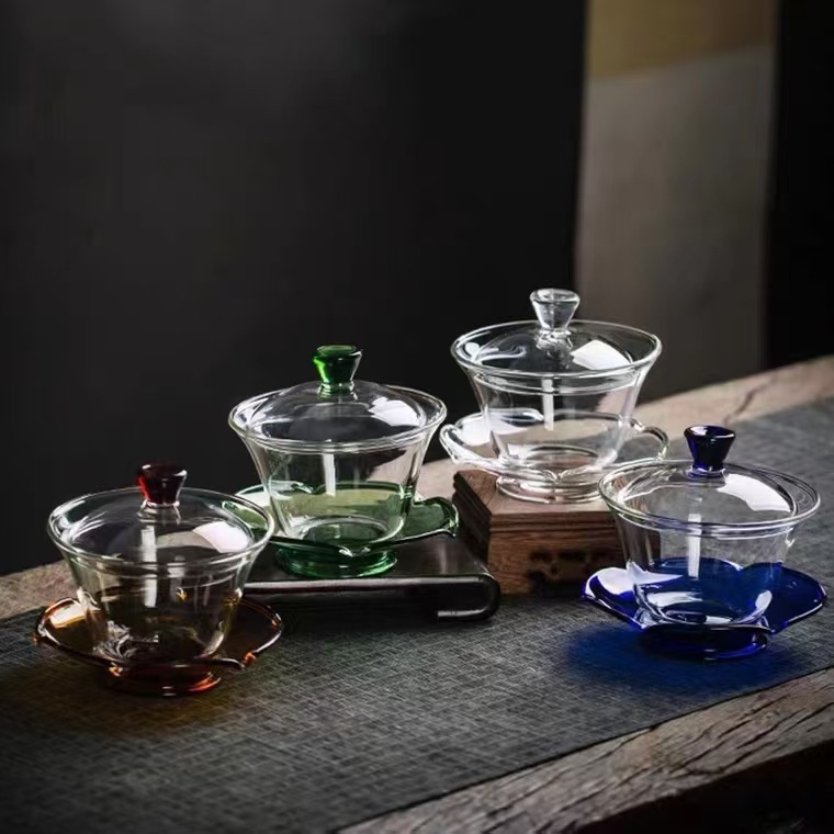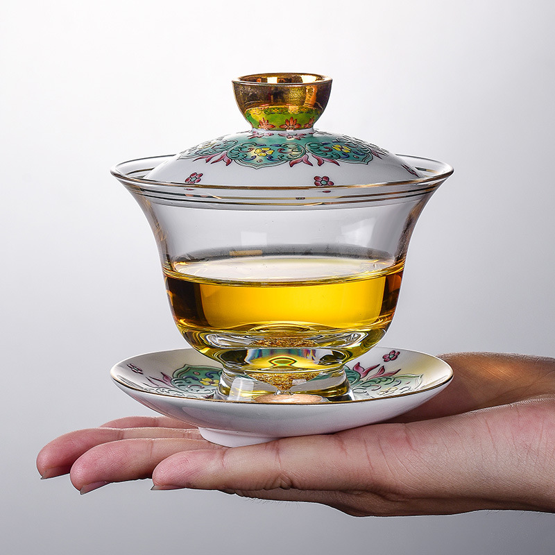 日本式高透ガラス蓋碗茶器三才中国式手掴み壺家庭用厚い茶碗