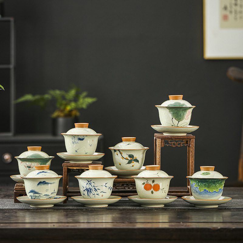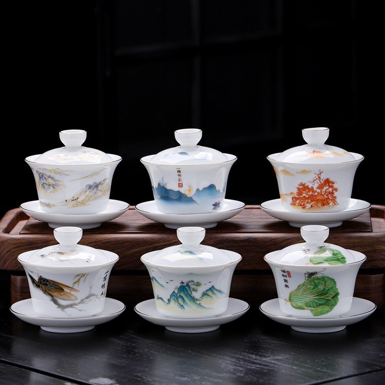 草木灰工夫三才蓋碗泡杯茶碗家庭用陶磁器単一中国風山水画敬茶碗パーマ防止