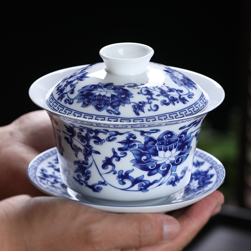 青花心経書道手描き陶磁器三才蓋碗茶杯単独で手を温めないでお茶を入れます。