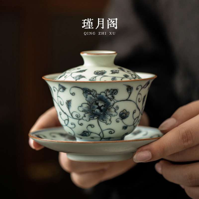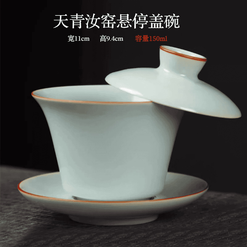 米黄汝窯青花磁器三才蓋碗中国式レトロ釉薬里紅家庭用主人杯壺承功夫茶コップ
