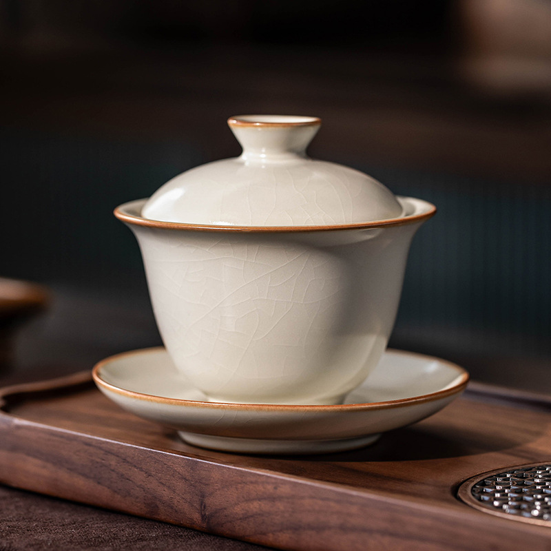 米黄汝窯復古三才蓋碗茶杯単一高級茶碗陶磁器家庭用工夫茶具開片