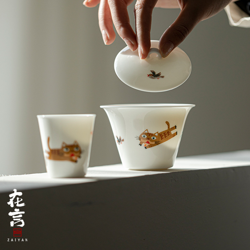 羊脂玉白磁猫趣文化創意陶器蓋付き茶碗、かわいい家庭用耐熱茶碗(蓋付き)