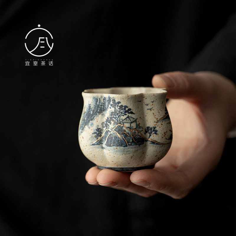 宜室茶話レトロ青花山水陶磁器カップ手描き描金花びら主人カップ個人専用