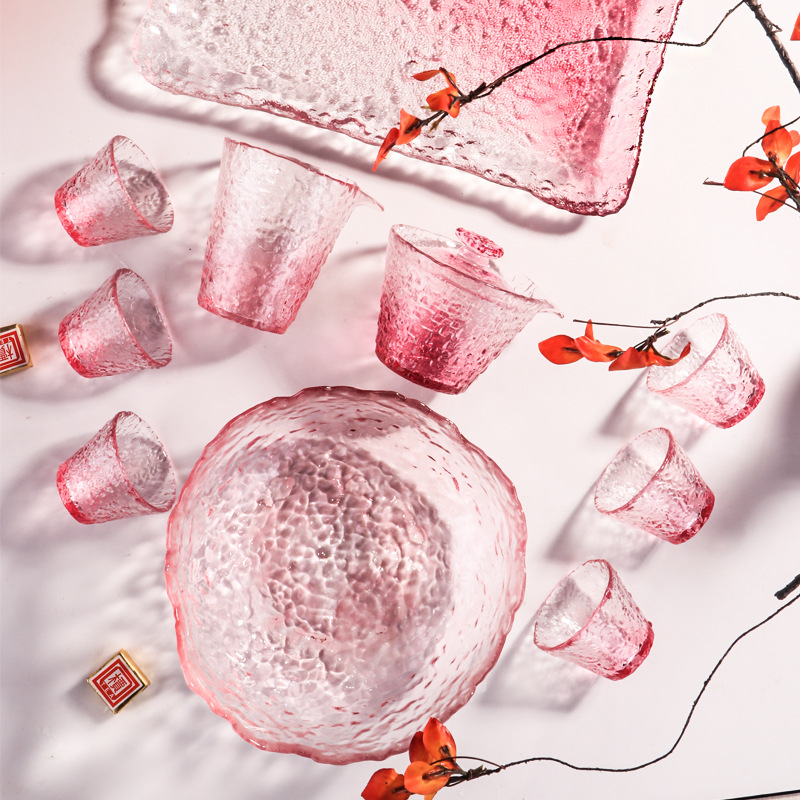 日本式の創意的なピンクのガラスの茶器のセットの氷の露の杯の3才の蓋の碗のお茶の海の初雪の工夫の杯の卸売り