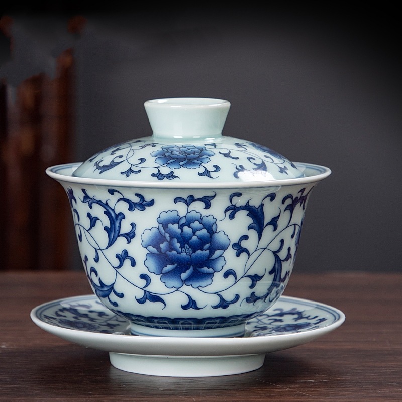 メーカー直供3.8インチ陶磁器三才蓋碗創意工夫茶具青花蓋碗茶杯logo