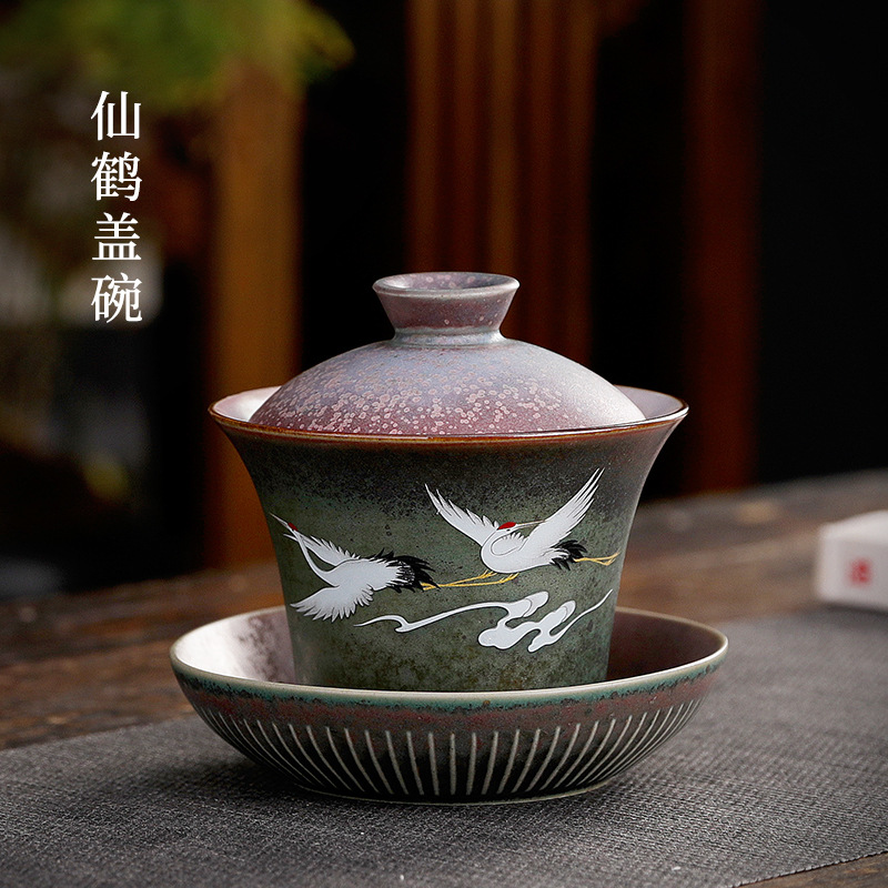 日本式窯変熙彩陶磁器三才蓋碗工夫茶器家庭用茶器創意仙鶴大サイズ敬茶碗