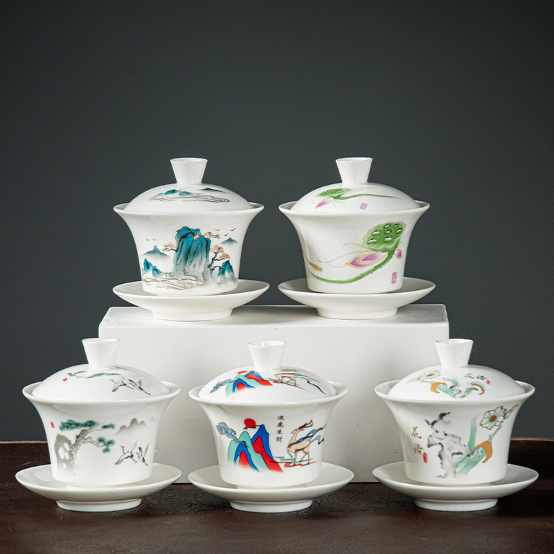 徳化県羊脂翡翠蓋ボウル茶碗大白三才ボウル蓋ボウルティーカップセラミック蓋付き印刷可能