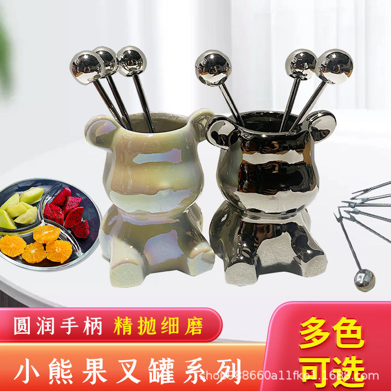 陶器製多機能クマ型台座 ステンレス製フルーツフォークセット 装飾ペン立て 収納瓶 フォーク クリエイティブギフト