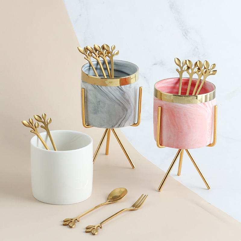 金縁大理石水家庭用デザートケーキフォークセットセラミックフォークスプーンジャー収納チューブペンホルダー