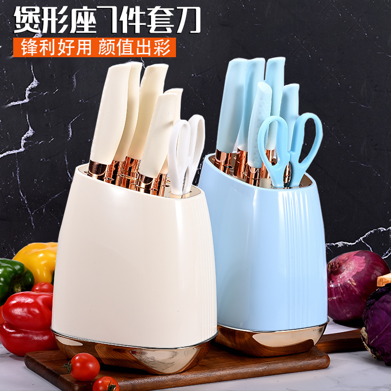 ナイフホルダー付きスポット卸売円筒形馬蹄ハンドル7点セットカラーナイフホルダーステンレス鋼包丁セット