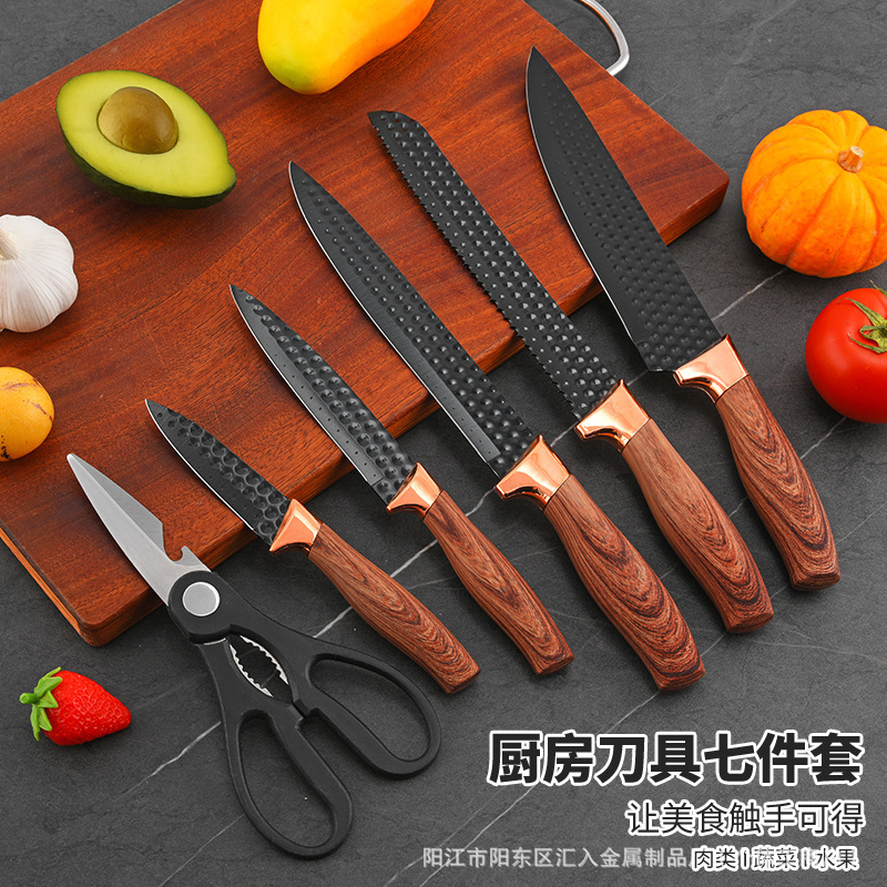 クロスボーダーナイフセットキッチンステンレス鋼ナイフセット家庭用ノンスティックナイフライト高級木目ハンドルナイフホルダー 7 点セット