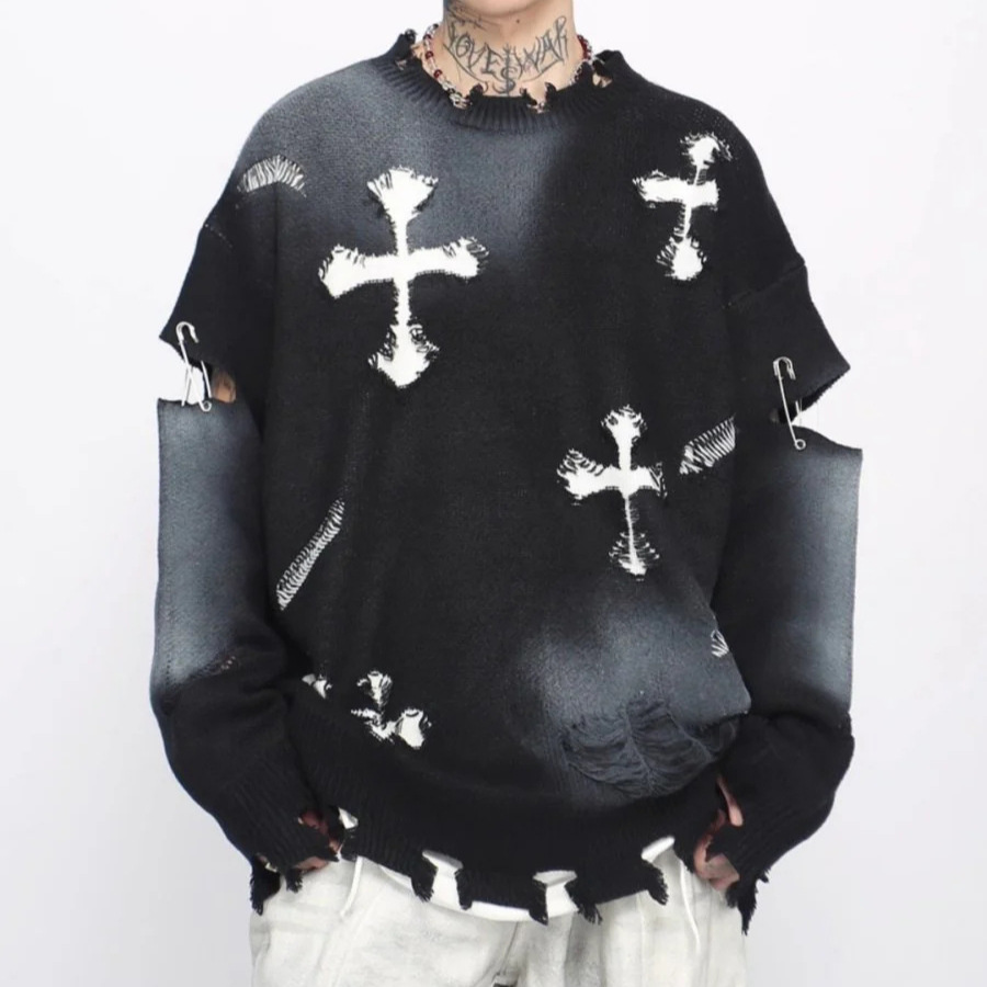 不規則な穴を割ったセーター女性秋冬新作ピン飾りデザインの街頭ファッションプルオーバー