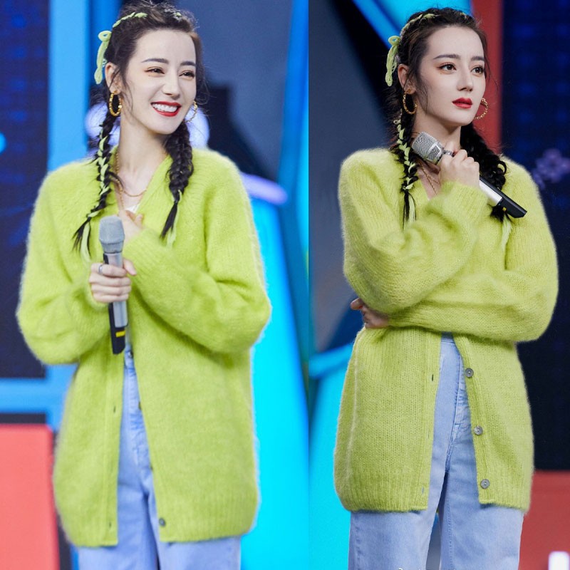 楽しい大本営の迪麗熱巴の同じタイプの中で長い蛍光の緑色のセーターのメリヤスのカーディガンのコートの女性の21春秋