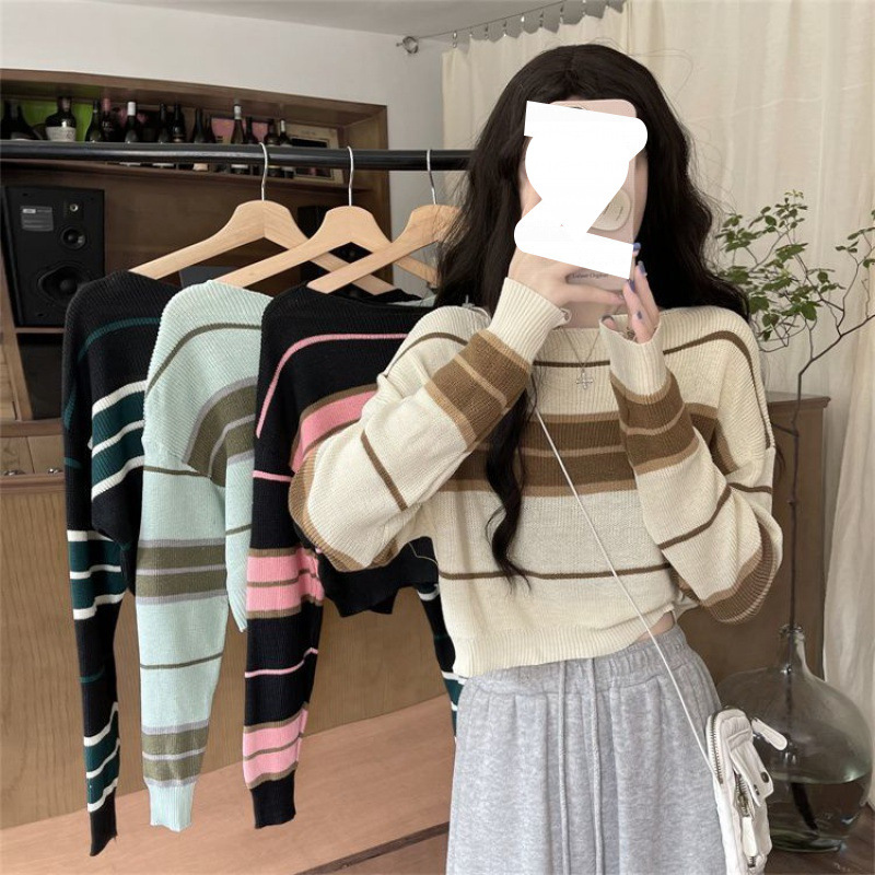 2023春新作甘美減齢カラーストライプニット韓国系丸襟ピンベアーセーターレディースファッション