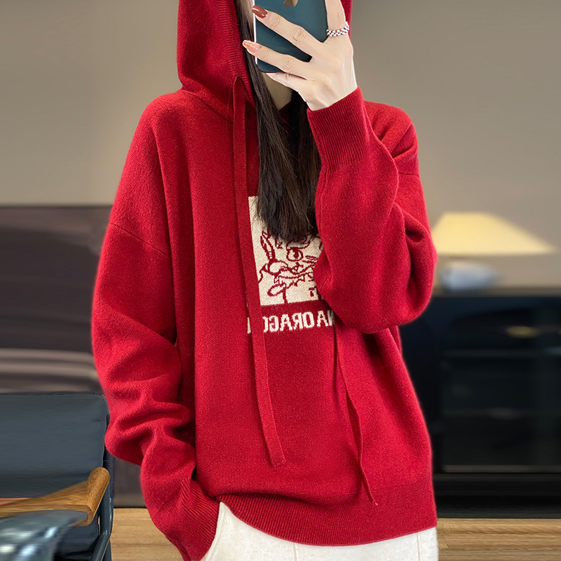 怠惰な帽子のプリントの底のシャツの女性本は来年の赤い長袖のセーターの秋冬の年齢を減らして中に帽子のニットの服をつけます。