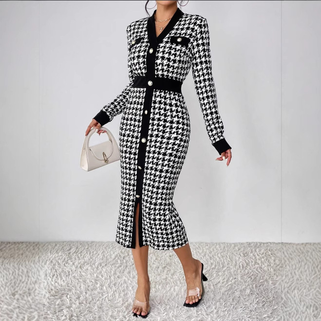 フレンチスタイルのファッショナブルなニットドレス2025秋冬新作Vネック千鳥格子セーター女性用ヒップカバーペンシルスカート