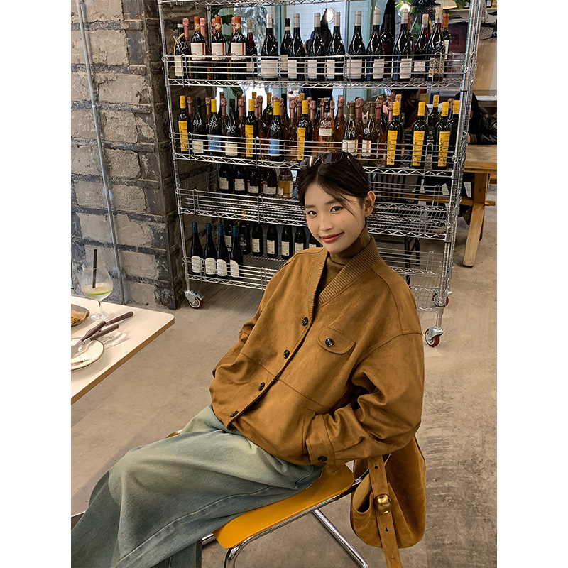 夢DT ETOLIE牛革ベルベットvネックレトロなジャケット野球服女性2024冬の超きれいなジャケット