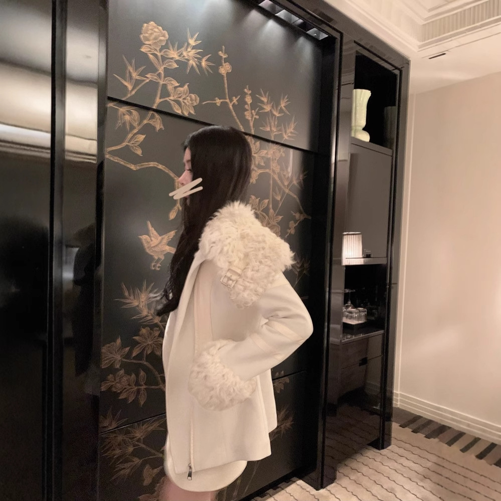 24aw新型白色環境保護毛皮一体羊小毛コート女性冬保温腰立襟ジャケット上着