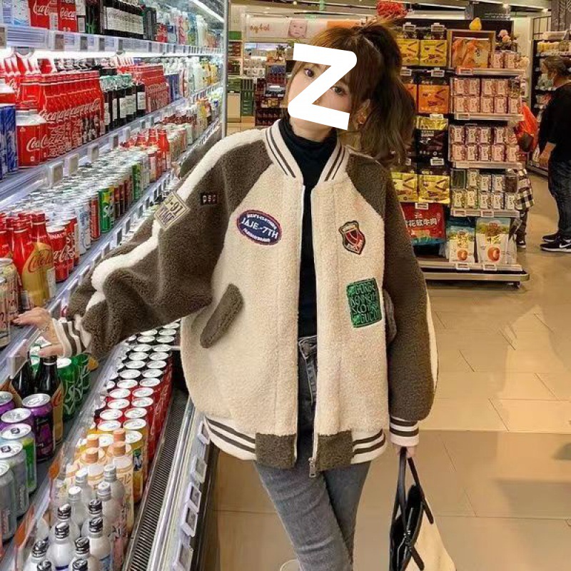 子羊の毛を厚くするコートの女性ヨーロッパ駅2024秋冬の新しいゆるい野球服ins学生ジャケット.