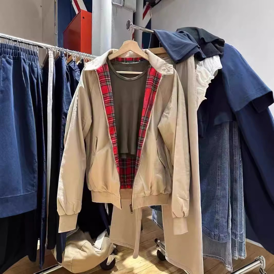 BM風新型アメリカンレトロジャケット赤チェック柄ポケットゆったり立襟パーカーレディース