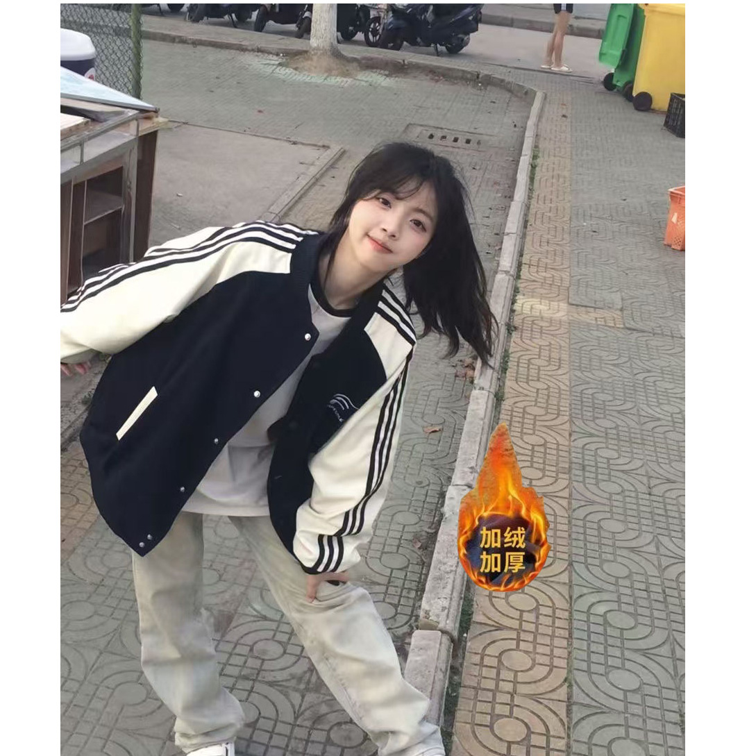 【ベルベット厚手】三本のバーが肩袖の野球服を着ている女性秋冬の新しいベルベットのジャケットカップル