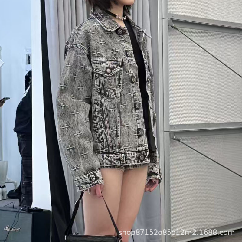 ヨーロッパとアメリカの2024春クロスボーダーリップドミッドレングスデニムジャケットアマゾンウォッシュレトロジャケット長袖レディースクロスボーダー