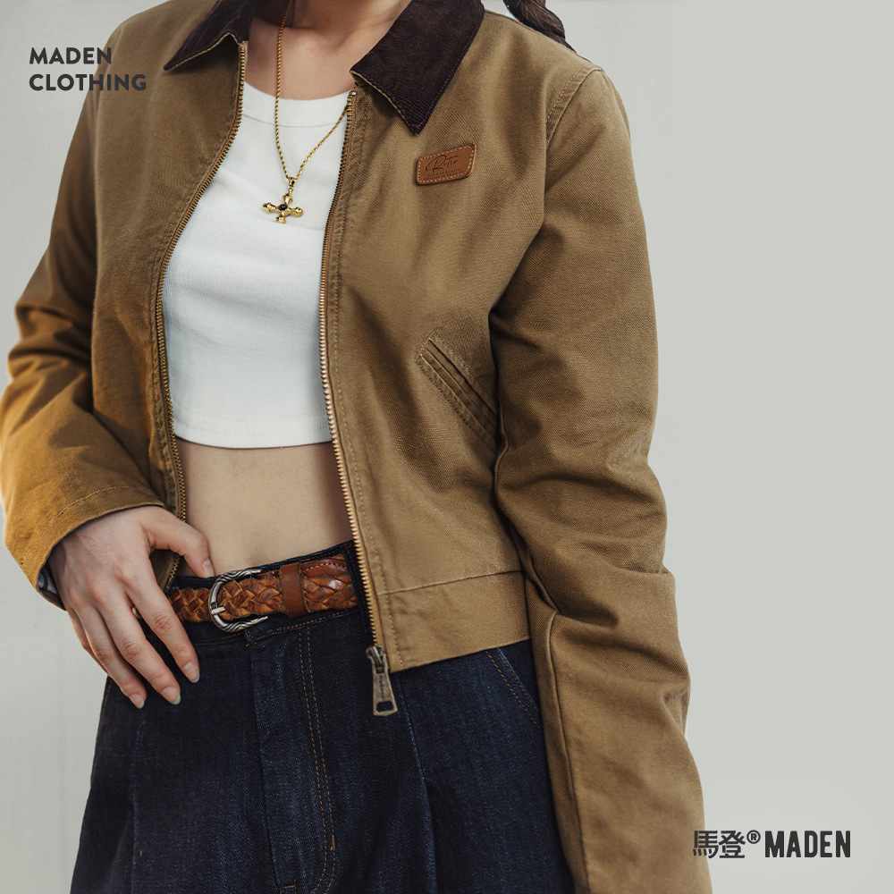 24秋冬のシックで洗練された綿質の斜紋布のボタンを合わせて色の襟の短い工装ジャケットのカジュアルコートの卸売りをします。