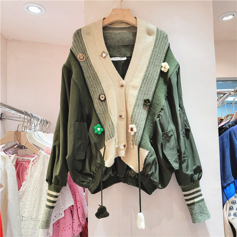2025年新作アメリカンレトロストリートバットスリーブニットジャケット、インスタ映えする配色切り替え、高級感のある万能トップス