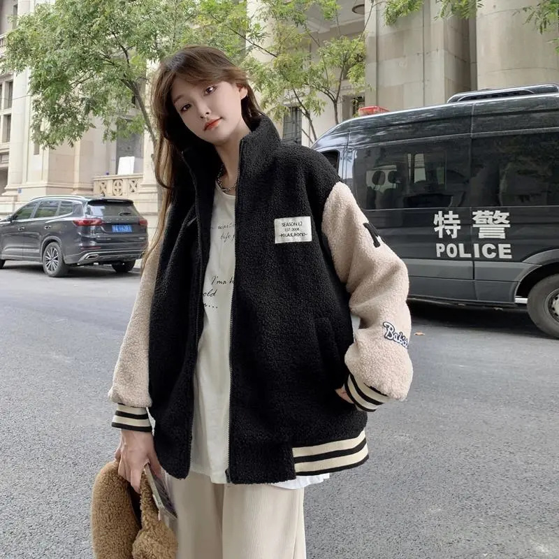 コート女性ヨーロッパ駅2025秋冬新型ゆるい野球服ins学生ジャケットは子羊の毛を厚くした