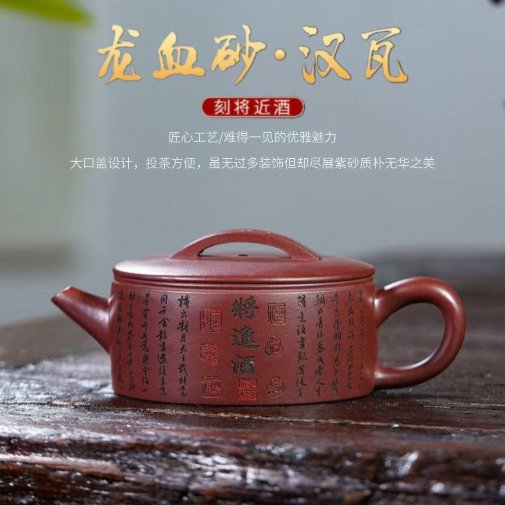 正統宜興紫砂壺原鉱陳腐紫泥満刻将進酒広口平漢瓦高級泡急須茶器